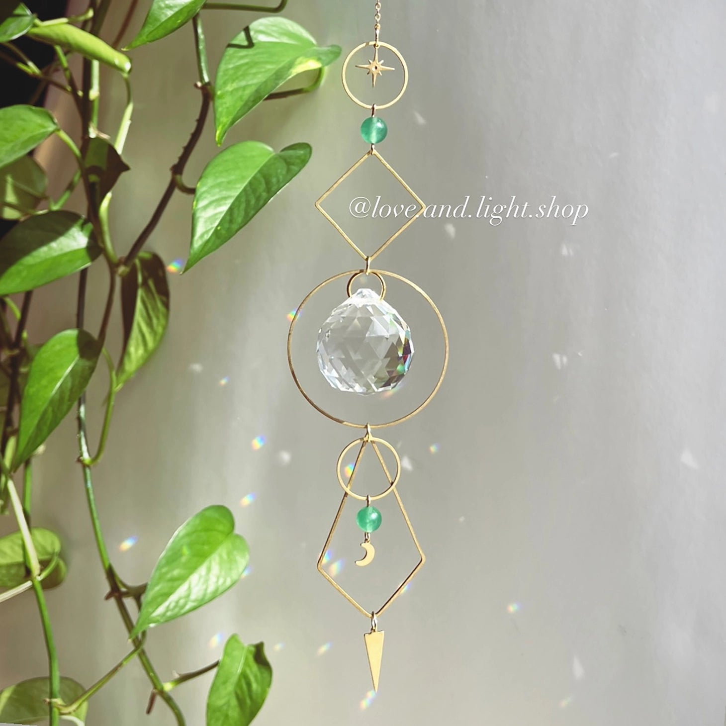 The Stargazer Collection by Love + Light features a celestial inspired suncatcher design, handmade with aventurine crystal beads, geometric brass shapes, a tiny crescent moon and north star charm, a 30mm faceted prism and assembled on a chain with a circle loop at the end to hang in a window.